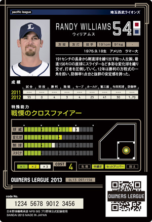 西武 ウィリアムス 2013年03月27日 2013 第1弾(第13弾) コンボ 継投○、万全リリーフトリオ(【L】13十亀、【L】13長田) 作戦スキル スキル ウィリアムスとは・・・ランディ・ウィリアムス、1975年9月18日、アメリカ合衆国出身 < 前の記事次の記事 >