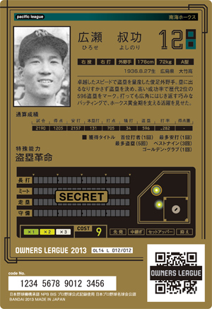 レジェンド 広瀬叔功 2013年07月04日 2013第2弾(第14弾レジェンド) コンボ キラー○(両)、GH○、俊足○、守備○ 超神速コンビ(【LE】11柴田勲) 機動力革命(【M02】石井琢朗) 作戦スキル ミート4↑、盗塁の神様 スキル リードオフマン、連続走塁○ ※↑好きなカード1枚から購入出来ます < 前の記事次の記事 >