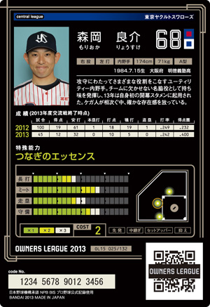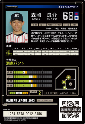 ヤクルト 森岡良介 2013年07月09日 2013第3弾(第15弾)画像はパック版 コンボ つなぎの二遊間 【Ys】14田中浩康 攻守の存在感 【E】15藤田一也 作戦スキル つなぎの意識(パック)、選球眼4↑(ウエハース) スキル チャンスメーカー(パック)、チャンス4↑(ウエハース) ※↑好きなカード1枚から購入出来ます 2013第2弾(第14弾) コンボ 作戦スキル スキル < 前の記事次の記事 >